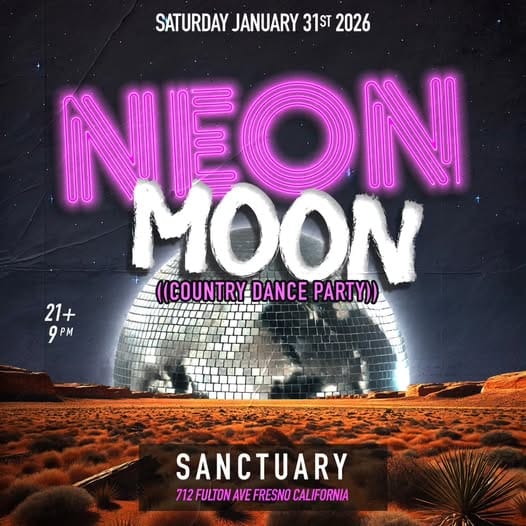 Neon Moon Country Dance Party lights up Sanctuary in Downtown Fresno on Saturday, January 31 at 8:00 PM for a high-energy night of country vibes and dance-floor fun. Grab your boots and hit the floor for a lively evening set to crowd-favorite country hits, perfect for a night out with friends. Tickets are $10.32, so it’s an easy yes for a fun Saturday night. 🤠🌙