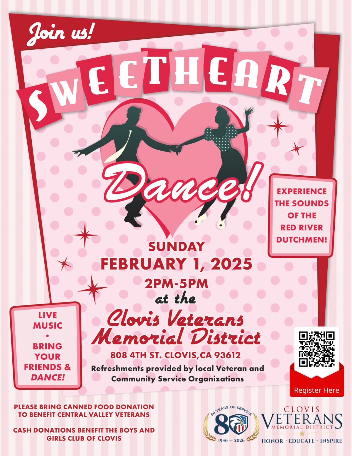 Sweethearts Dance brings an afternoon of music, movement, and community to the Clovis Veterans Memorial District on Sunday, February 1, 2026, from 2:00 PM to 5:00 PM.🕺💃 This free, family-friendly event invites you to grab your Valentine and enjoy swing dancing tunes while supporting a great cause. Refreshments will be available, with canned food donations benefiting Valley Veterans and cash donations supporting the Boys & Girls Club of Clovis. 💕