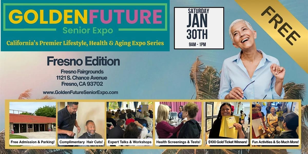 2027 Golden Future Senior Expo – Fresno Edition is a free, high-energy lifestyle and wellness event on Saturday, January 30, 2027 (9 AM–1 PM) at the Big Fresno Fairgrounds, featuring 60+ exhibitors, free health screenings, workshops, live entertainment, giveaways, and fun activities because getting older should come with perks. Designed for seniors, caregivers, families, and aging professionals, this once-a-year Fresno event brings the community together to connect, learn, and enjoy a lively, inspiring day.