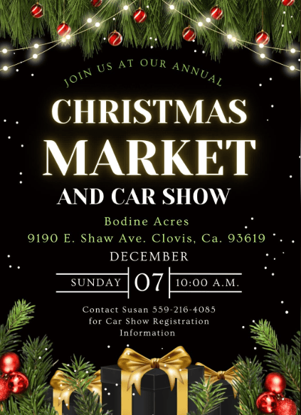 Get into the holiday spirit at the Christmas Market and Car Show in Clovis! 🎄🚗 On Sunday, December 7th starting at 10 AM, explore over 3 acres of unique vendors offering Christmas gifts, check out remarkable cars, and join in a festive raffle. Proceeds from the car show go to help those in need this holiday season, fun, shopping, and giving all in one day! ✨ Bring the whole family and enjoy a day of holiday cheer, delicious treats, and community spirit. Don’t miss this perfect kickoff to your festive season!