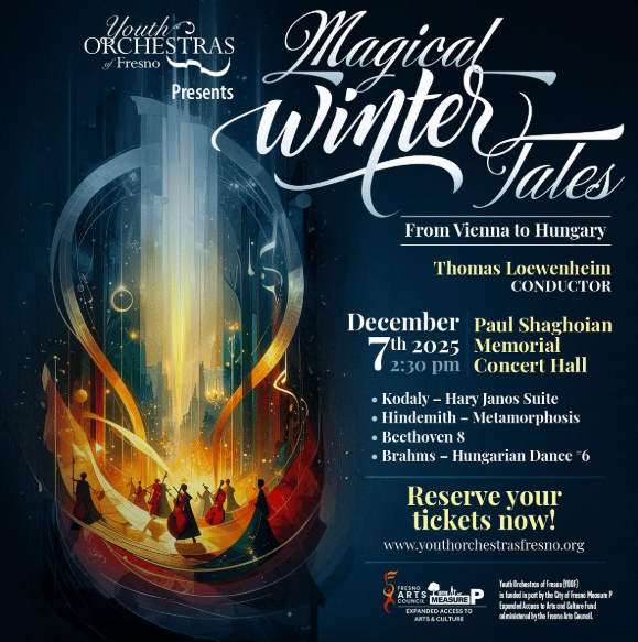 Experience the season in song at Magical Winter Tales at Paul Shaghoian Concert Hall! 🎶❄️ On Sunday, December 7th at 2:30 PM, enjoy an enchanting program featuring Hindemith’s Symphonic Metamorphosis, Beethoven’s Eighth Symphony, Brahms’ Hungarian Dance No. 6, and Kodály’s Háry János Suite. Celebrate the holidays with energy, charm, and a touch of Hungarian flair—an afternoon of music the whole family will love! ✨ Don’t miss this festive performance that promises to fill the hall with joy and holiday spirit!