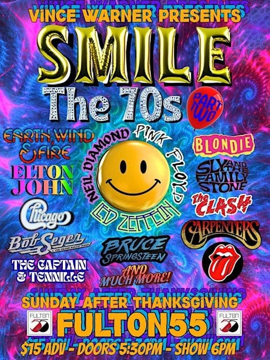 Get ready for a groovy throwback at SMILE: The 70’s Part Two on Sunday, November 30th, at Fulton 55! 🎶🕺 This 21+ event brings another stellar lineup curated by Vince Warner, featuring talented local musicians performing a full night of iconic 70s hits. Dust off those bell-bottoms and dive into an evening of disco, funk, and rock ’n’ roll as you relive the decade’s most unforgettable sounds. Don’t miss this blast from the past—tickets are available now at fulton55.com.