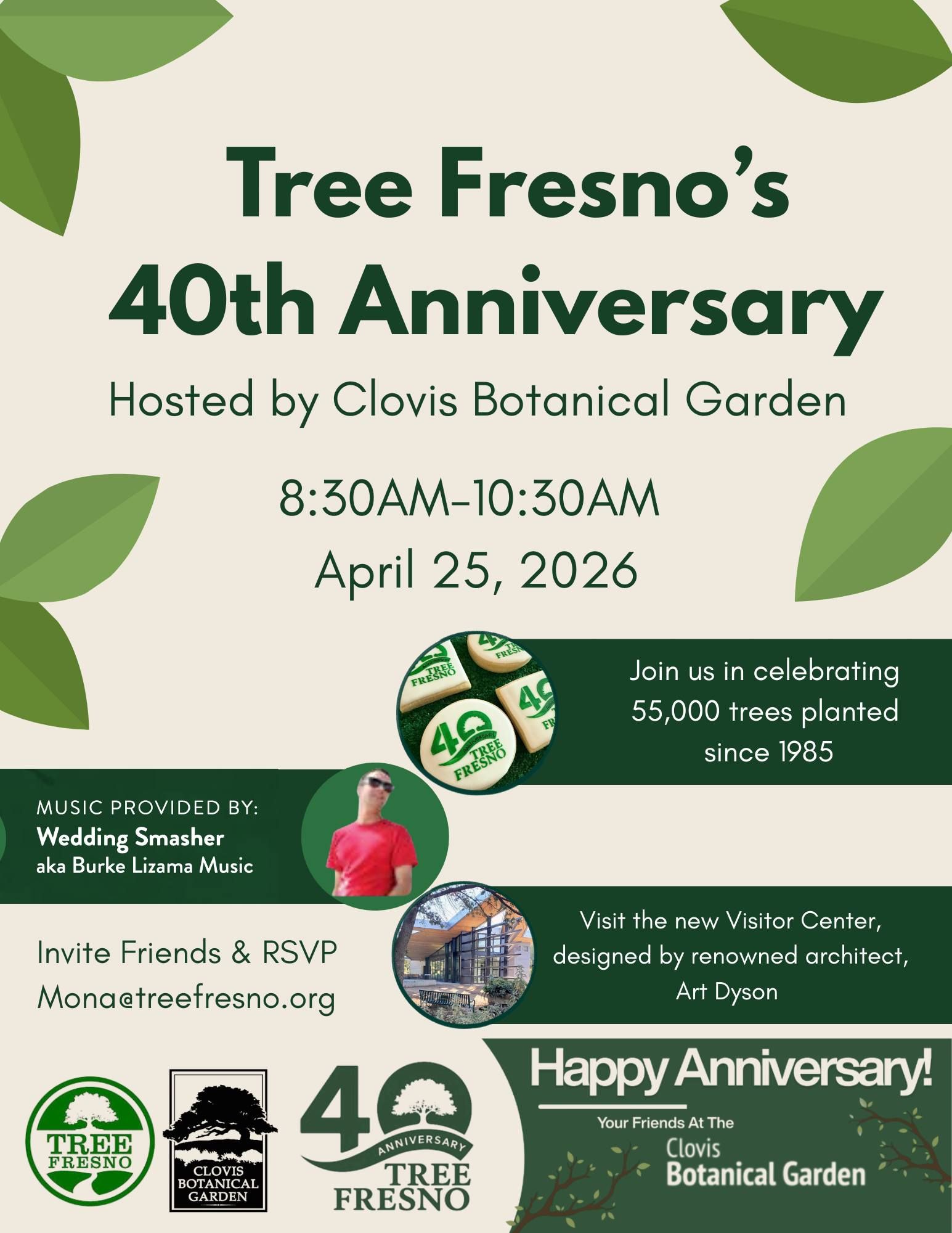 One event to lock in right now is the Tree Fresno’s 40th Anniversary celebration 🌳🎉. Happening Saturday, April 25 from 8:30AM–10:30AM at the Clovis Botanical Garden, this one’s all about community, nature, and celebrating a huge milestone 55,000 trees planted since 1985. Even better? It’s completely FREE (yes, FREE FREE FREE). You’ll get to check out the brand new Visitor Center designed by renowned architect Art Dyson, enjoy live music from Burke Lizama (aka Wedding Smasher), and just soak in a super positive, outdoorsy vibe. Perfect morning plan if you’re not running the Clovis Arbor Day Race -just show up, bring a friend, and celebrate something that’s made a real impact right here in our city. Get more info here!